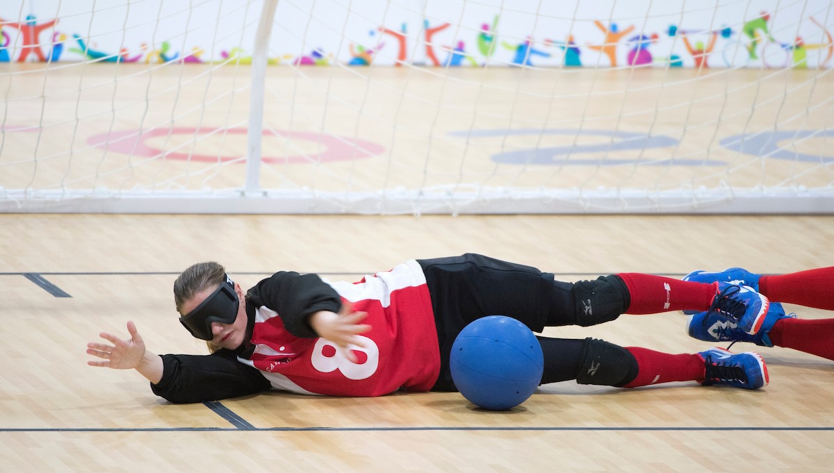 There are two teams, each made up of three players on the court at a time. Athletes roll balls that have bells inside, trying to get the ball into the opposing team’s net. All athletes guard the net and dive to protect the ball from entering the goal. The team with the most goals wins the game.